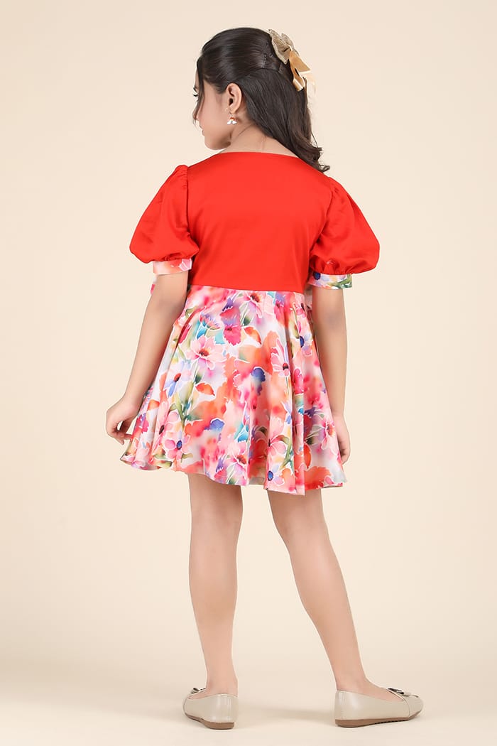 - Colour: Tangerine Red Bodice with Multi-Hued Floral Print Skirt