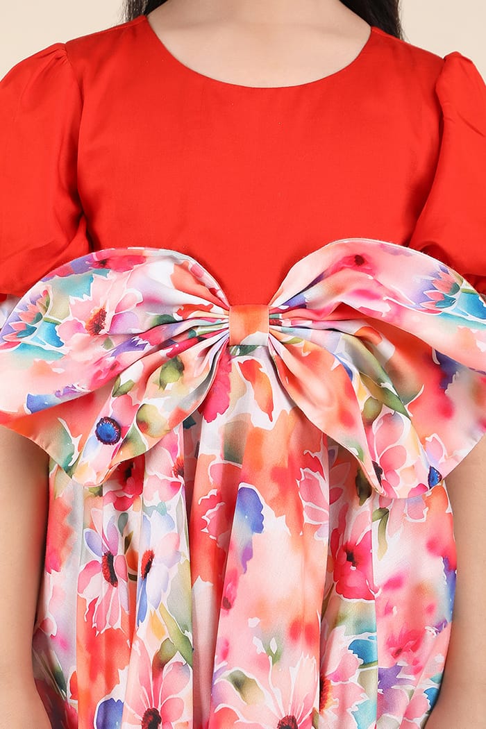 Introducing: The Fiery Bloom Bow Dress – a stunning fusion of solid sophistication and artistic florals! Designed for little divas who love to shine, this dress features a striking tangerine red bodice crafted from luxurious cotton satin fabric, exuding elegance and comfort. The highlight? A dramatic oversized bow at the waistline, adorned with an impressionist floral print in vibrant hues, inspired by drenched blooms, watery paintings, and shadowy blurs—one of the season’s hottest trends! The puff sleeves with structured cuffs add a touch of vintage charm, while the flared skirt ensures picture-perfect twirls.