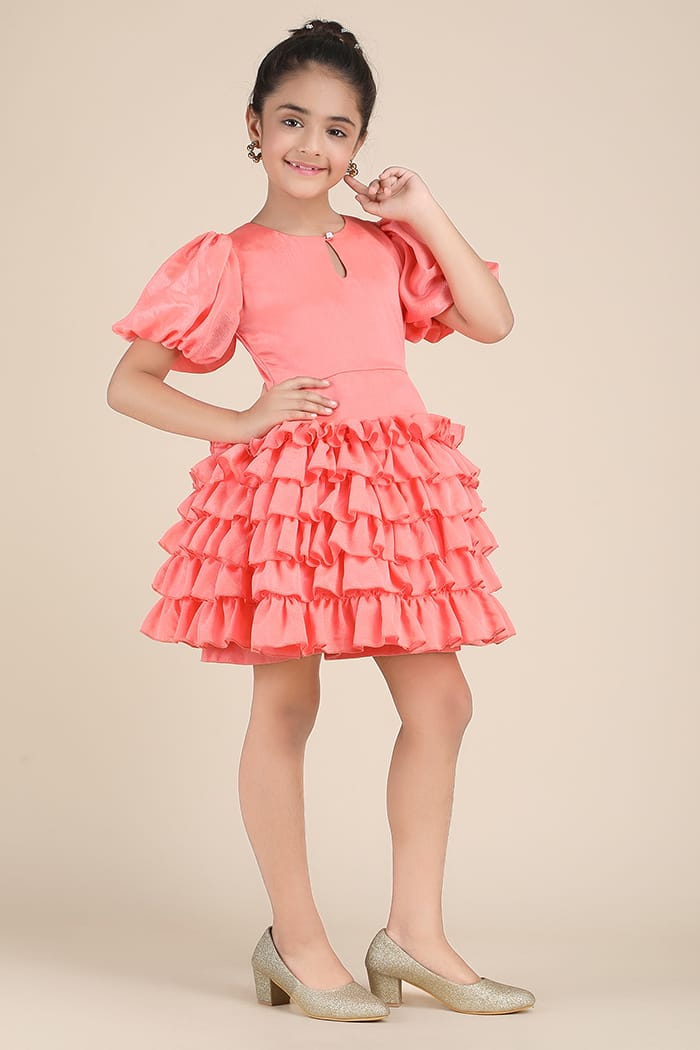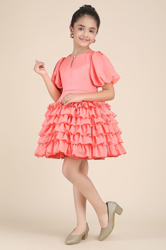 Drape your little fashionista in pure elegance and flair with this Vibrant Coral Fit & Flare Dress, crafted from luxurious crinkle chinon silk fabric. The soft, flowy texture of the fabric enhances the dreamy silhouette, making every twirl feel weightless and graceful. Designed with cascading ruffle layers for a voluminous, fairy-tale effect, this dress is made to turn heads. The charming puff sleeves add a touch of vintage glamour, while the round neckline with a delicate keyhole tied with a pearl button exudes sophistication.