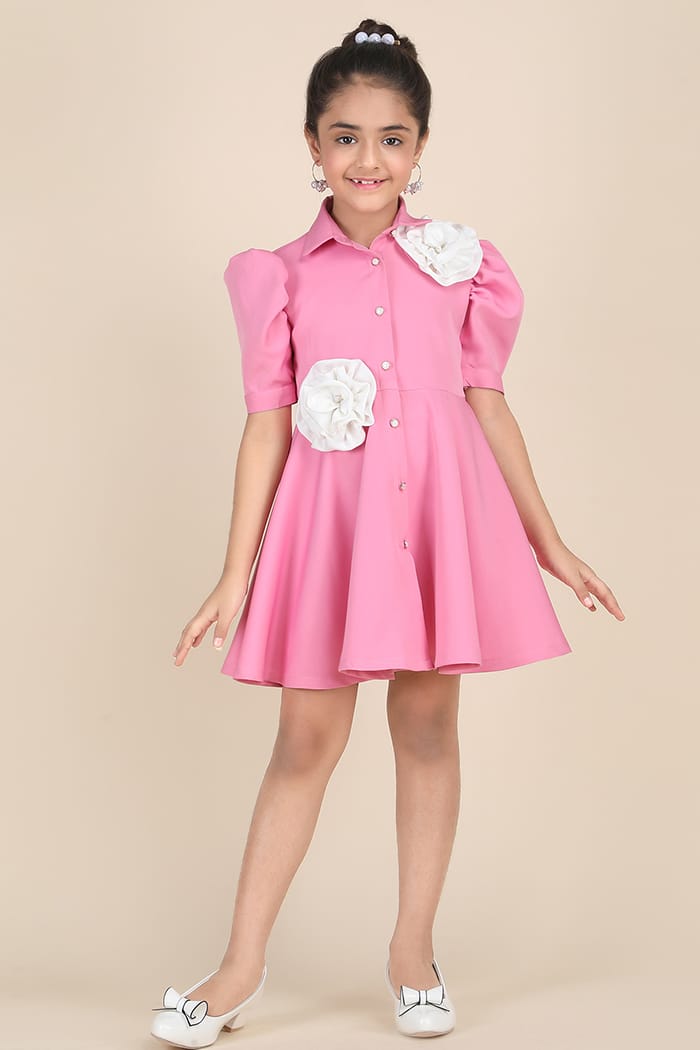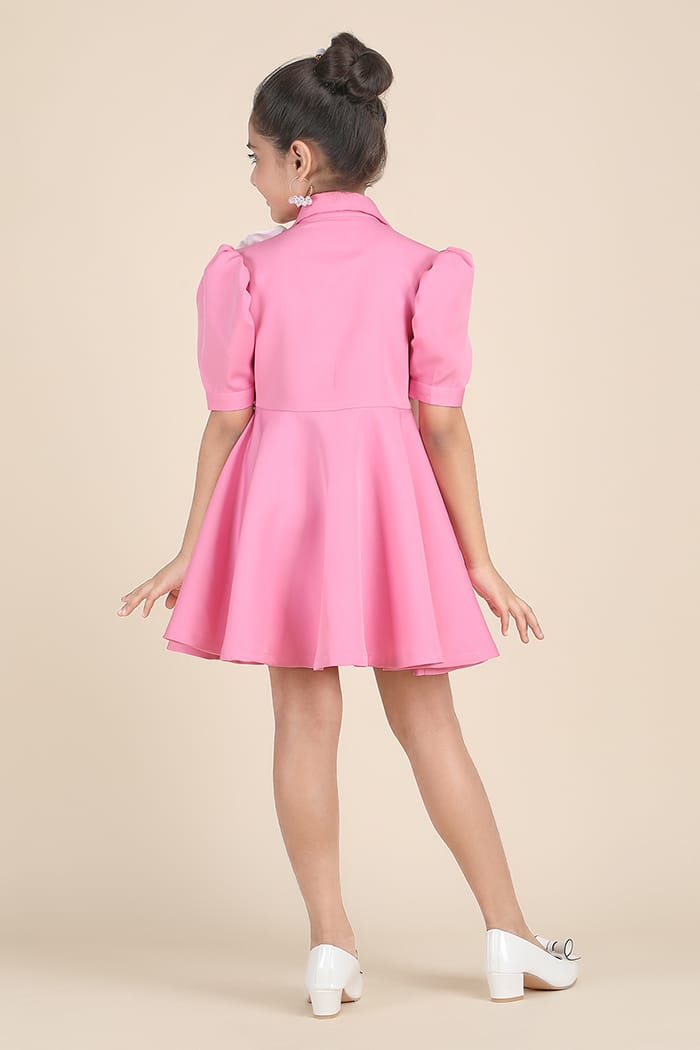 A dreamy fusion of sophistication and charm, this pastel pink fit-and-flare dress is a must-have for your little fashionista. Made from premium banana crepe imported fabric, it features a classic shirt collar, pearl-embellished button-down front, and elegant white satin floral appliqués. The structured half-length puff sleeves add a touch of vintage glamour, while the flared hem ensures a graceful twirl with every step.